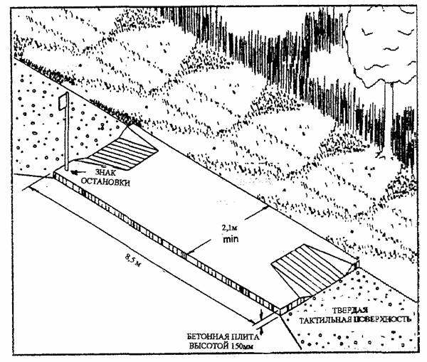 Край платформы оборудуется используемой всеми пассажирами предупреждающей полосой, как правило, ярко-желтого цвета с выраженной фактурой поверхности, осязаемой как через подошвы, так и при помощи палочки. При необходимости перехода на соседнюю платформу устраивается выровненный с поверхностью рельсов переход с соответствующим расширением предупреждающей полосы. 4. АВТОСТОЯНКИ4.1. ОБОЗНАЧЕНИЕ СТОЯНКИ НА