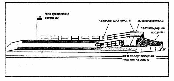Мини-платформы на узловых городских остановках обеспечивают доступность поездов и трамваев. Для входа и выхода пассажиров используют либо откидной мостик над ступенями, закрепленный на боковой стенке вагона, либо переносной пандус, который устанавливается водителем и хранится в специальной нише позади водительского места. Размеры габаритов платформ см. в Выпуске 1 - раздел 10, п. 4.1. настоящего Пособия. 3.6. ПЛАТФОРМЫ НА ОСТАНОВКАХ РЕЛЬСОВОГО