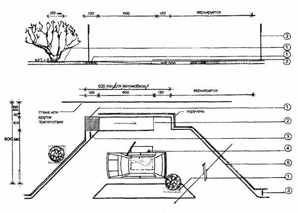 1. Изменение фактуры или цвета покрытия 2. Пандус 6% с боковыми бортиками 3. Знак с международным символом