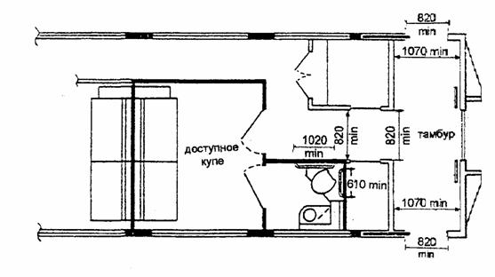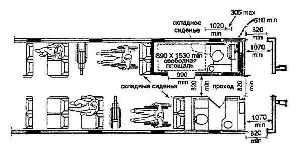 Приспособленная для инвалидов часть вагона 1 класса (немецкая железнодорожная колея) 9. ОБОРУДОВАНИЕ САЛОНОВ9.1. ГАБАРИТЫ ПРОСТРАНСТВА [5]