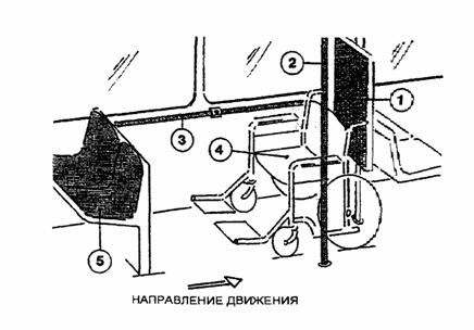 1. Мощный опорный щит с мягким покрытием 2. Вертикальная стойка со стороны прохода 3. Горизонтальный поручень 4. Положение кресла-коляски, обращенного