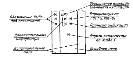 3. В первой строке основного поля УГО указывают обозначение функции индикации: DPY. Во второй строке, при необходимости, приводят обозначение типа устройства по ГОСТ 2.708-81. Начиная с третьей строки, допускается указывать требуемую дополнительно информацию, например, принцип индикации: