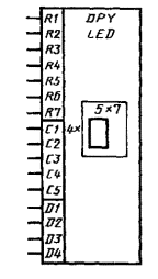 7. Люминесцентный индикатор с матрицей 5´7 для индикации четырех буквенно-цифровых знаков при помощи четырех интегральных схем, работающих в режиме временного уплотнения (обозначение строк - R, столбцов - С, входов управляющих импульсов - D)