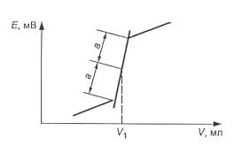 Черт. 1 Для титрования применяют бюретку емкостью 2 - 10 мл с иеной деления не более 0,1 мл. Титрование проводят следующим образом. В стакан для титрования наливают приготовленный экстракт. Стакан устанавливают на магнитную мешалку и помешают в пего электроды. Включают мешалку. Бюретку заполняют 1,0 н. спиртовым раствором соляной кислоты и помещают в штатив так, чтобы конец бюретки находился на расстоянии 20 - 25 мм от поверхности титруемого раствора. Отмечают начальный уровень раствора в бюретке и начальное показание потенциометра, затем прибавляют небольшими порциями (по 0,1 мл) 1,0 н. спиртовой раствор соляной кислоты. После добавления каждой порции соляной кислоты фиксируют показания потенциометра. Титрование заканчивают, когда потенциал после добавления 0,2 мл соляной кислоты изменяется менее, чем на 5 мВ. Вычерчивают кривую титрования, откладывая на оси ординат показания потенциометра Е в милливольтах, а на оси абсцисс - объем добавленного раствора V в миллилитрах. За точку эквивалентности принимают точку перегиба кривой титрования. На черт. 2