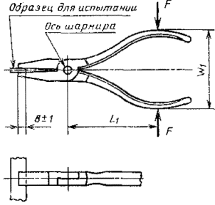 шарнира (черт. 2). 4.6. Плоскогубцы типов 1 и 2 проверяют на прочность рукояток и кручение. Испытания проводят до насаживания изолирующих рукояток. 4.7. Испытания плоскогубцев на прочность рукояток проводят приложением