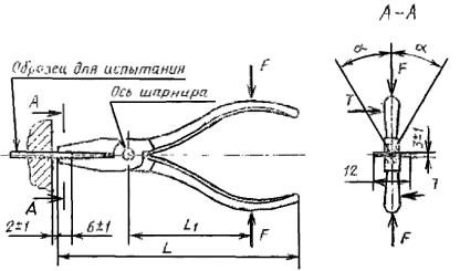 зажимной поверхностью плоскогубцев образец-пластину с сечением 3´12 мм твердостью 46 ... 51,5НRСэ. Прикладывают