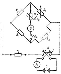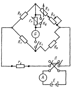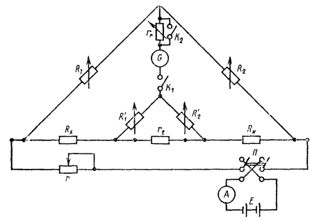измерения двойным мостом Е - источник постоянного тока; А - амперметр; G - гальванометр; rE - электрическое сопротивление, ограничивающее ток; r - реостат; П - переключатель для измерения направления тока при измерении; R1, R2, R'1, R'2, R'3 - электрическое сопротивление плеч моста; K1, K2 - ключи для включения н выключения гальванометра и защитного электрического сопротивления; RN - эталонное электрическое сопротивление; Rk - электрическое сопротивление, служащее для компенсации электрического сопротивления проводов, соединяющих кабельное изделие с мостом; r2 - электрическое сопротивление провода, соединяющего образцовое и измеряемое электрическое сопротивление двойного моста; r1 - защитное электрическое сопротивление гальванометра; RX - измеряемое электрическое сопротивление 2.2. При измерении по схеме двойного моста значение электрического