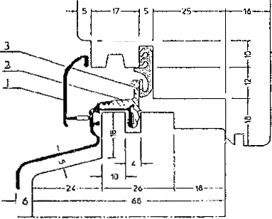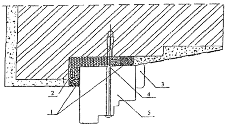 снаружи; 1 - уплотняющие прокладки (снаружи - водонепроницаемые, изнутри - паронепроницаемые); 2 - пеноутеплитель; 3 -деревянный нащельник; 4 - строительный дюбель; 5 - брусок оконной коробки Рисунок 8 - Пример монтажного узла