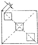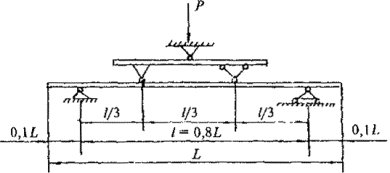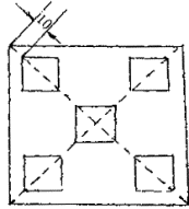 8.2 Определение предела прочности на растяжение при изгибе архитектурно-строительных изделий и декоративных плитСущность метода заключается в измерении максимальной разрушающей нагрузки, передаваемой через шаровой шарнир образцу, установленному на двух опорах. 8.2.1 Средства контроля и вспомогательное оборудованиеПресс гидравлический с усилием от 100 до 500 кН по ГОСТ 28840 или ГОСТ 9753 с регулируемой скоростью приложения нагрузки и силоизмерителем с погрешностью измерения не более 2 %. Машина камнерезная для изготовления образцов, снабженная отрезными алмазными кругами диаметром не менее 250 мм по ГОСТ 10110 или ГОСТ 16115. Плита поверочная по ГОСТ 10905 или стойка типа C-III по ГОСТ 10197 с индикатором часового типа по ГОСТ 577 или индикатором многооборотным по ГОСТ 9696. Штангенциркуль по ГОСТ 166. Угольник поверочный по ГОСТ 3749. Устройство для испытания изделий из прочных и средней прочности пород по 6.6.1. Нагрузка от испытательной машины передается центрально по середине пролета образца-призмы через шаровой шарнир по однопролетной схеме (рисунок 2). Устройство для испытания изделий из низкопрочных пород по 6.6.1. Нагрузка от испытательной машины на образец передается через шаровой шарнир на распределительную траверсу (рисунок 3). 8.2.2 Порядок подготовки к испытанию и проведение испытанияОбразцы для испытаний изготавливают размерами по 6.6.2 выпиливанием из изделий или по технологии изготовления соответствующего типа изделия. Высушенный образец изделия измеряют, устанавливают лицевой поверхностью вверх на две опоры и прикладывают в середине образца нагрузку. Для изделий из прочных и средней прочности горных пород применяют соответствующие 6.6.1 и рисункам 2 и 3 устройство и схемы нагружения. Для изделий из низкопрочных горных пород применяют устройство по 6.6.1 и схему нагружения по рисунку 3. Расстояние между опорами выбирают в зависимости от размеров изделия и регулируют в пределах 80 % его длины. Нагружение проводят равномерно до разрушения. 8.2.3 Обработка результатов испытанияПредел прочности на растяжение при изгибе вычисляют по формулам (9) и (10) с точностью до 0,05 МПа как среднеарифметическое значение результатов испытания пяти образцов. 8.3 Определение коэффициента камненасыщения декоративных плит (точечный метод)Сущность метода заключается в определении площади, занимаемой природным камнем на лицевой поверхности плит, и последующего расчета коэффициента камненасыщения. 8.3.1 Порядок подготовке к испытанию и проведение испытанияНа поверхность проверяемой плиты наносят от 1 до 5 квадратов размером 10´10 см. Количество квадратов определяют в зависимости от размеров плит: 1 квадрат - для плит размером 200´200; 200´300; 300´300 мм; 2 квадрата - для плит размером 300´400; 400´400; 400´500 мм; 5 квадратов - для плит больших размеров. В случае неравномерного размещения природного камня на поверхности плиты количество квадратов вместо одного-двух может быть три. Схемы размещения квадратов даны на рисунках 9-12. Один квадрат располагают в центре плиты. Два квадрата располагают в противоположных углах плиты на расстоянии 10 мм по диагонали от вершины угла. Три квадрата располагают следующим образом: один - в центре плиты и два - в противоположных углах плиты на расстоянии 10 мм по диагонали от вершины угла. Пять квадратов располагают следующим образом: один - в центре плиты и ч