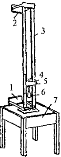 - зажим; 6 - боек; 7 – ящик Рисунок 4 - Копер для испытания на ударное воздействие 6.7.3 Обработка результатов испытанияВ качестве показателя сопротивления горной породы ударному воздействию принимают минимальную высоту сбрасывания гири в сантиметрах, при которой на образце появились трещины или произошло его разрушение. Сопротивление горной породы ударным воздействиям вычисляют как среднеарифметическое значение результатов испытания четырех образцов. 6.8 Определение истираемости горной породыСущность метода заключается в определении потери массы или объема образца горной породы, прошедшего не менее 1000 м пути истирания. 6.8.1 Средства контроля и вспомогательное оборудованиеКруг истирания ЛКИ-3 (рисунок 5) или аналогичные. Весы лабораторные по ГОСТ 24104. Штангенциркуль по ГОСТ 166. Щетка. Линейка измерительная металлическая по ГОСТ 427. Шлифзерно карбид кремния зеленый марок 63 С или 64 С, или карбид кремния черный марок 55 С и 54 С. Круги истирания должны иметь съемный, вращающийся в горизонтальной плоскости истирающий диск, изготовленный из серого чугуна твердостью по Шору 30-50 (185-215 кН/см2). На поверхности истирающего диска не допускаются выбоины и углубления шириной более 5 мм и глубиной более 0,5 мм. Скорость вращения истирающего диска под нагрузкой должна быть (30±1) об/мин. Круг истирания должен быть оборудован приспособлением для свободной (в вертикальной плоскости) установки образцов и их загружения вертикальной нагрузкой, а также счетчиком оборотов с автоматическим выключением истирающего диска через каждые 30 м пути истирания. 1 - истирающий диск; 2