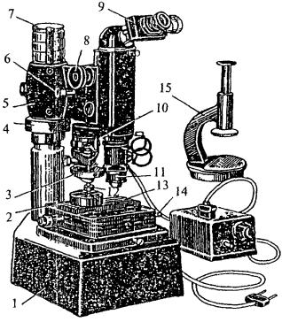 оправка с алмазным наконечником; 13 - планка для закрепления исследуемого