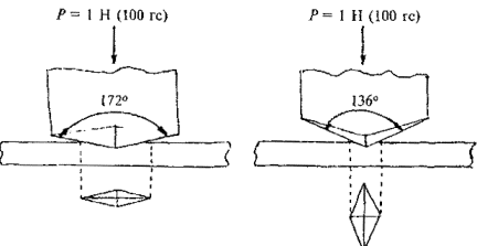 образца; 14 - рукоятка для поворота столика; 15 - ручной прессик Рисунок 6 - Общий вид прибора ПМТ-3 для определения микротвердости Образец укладывают на планку и закрепляют скотчем или пластилином так, чтобы исследуемая поверхность образца располагалась параллельно рабочей плоскости стола. Планку с образцом помещают на столик и при помощи микроскопа выбирают место для нанесения отпечатка. Поворачивая столик на 180° вокруг вертикальной оси при помощи рукоятки, подводят выбранное на образце место под острие алмазной пирамиды и вдавливают ее в образец. Давление на пирамиду оказывают грузом массой (100±5) г. Продолжительность выдержки под нагрузкой должна быть от 5 до 10 с. Алмазный наконечник (пирамиду) с грузом возвращают в прежнее положение. Образец устанавливают против микроскопа для измерения длины диагонали. Совмещая отпечаток с перекрестием, измеряют длину диагонали отпечатка. На каждом образце производят десять измерений по двум линиям, параллельным длинной стороне образца. Расстояние между линиями и первой точкой от края образца - 20 мм, между соседними точками - 10 мм. Рисунок 7 - Алмазный наконечник (пирамида) твердомера За результат измерения на данном образце принимают длину максимальной диагонали отпечатка. Микротвердость Н, кгс/мм2, вычисляют по формуле где Р - нагрузка, Н (гс); l - длина диагонали отпечатка, мкм. За результат испытания принимают среднеарифметическое значение четырех параллельных испытаний. 6.10 Определение морозостойкости горной пародыСущность метода заключается в определении прочности горной породы после заданного числа циклов попеременного замораживания и оттаивания. 6.10.1 Средства контроля и вспомогательное оборудованиеКамера морозильная, обеспечивающая достижение и поддержание температуры минус (20±2) °С. Шкаф сушильный. Пресс гидравлический с максимальным усилием до 500 кН по ГОСТ 28840. Ванна с устройством для поддержания температуры (20±2) °С для насыщения образцов водой и их оттаивания. Контейнеры для образцов. 6.10.2 Порядок подготовки к испытанию и проведение испытанияДля каждого испытания изготавливают по 6.5.2 пять образцов горной породы, для пород с выраженной слоистостью - десять образцов. Образцы укладывают в ванну на решетку в один ряд и заливают водой так, чтобы уровень воды был выше верха образцов на 20 мм. Образцы выдерживают в воде 48 ч, после чего образцы извлекают из ванны, удаляют влагу с поверхности образцов мягкой влажной тканью. Образцы устанавливают в контейнер или на сетчатый стеллаж морозильной камеры так, чтобы расстояние между образцами, стенками контейнера и вышележащими стеллажами было не менее 30 мм. Началом замораживания считают момент установления в камере температуры минус 18 °С. Продолжительность выдерживания образцов в камере при температуре минус (20±2) °С должна составлять 4 ч, после чего образцы помещают в ванну и выдерживают в ней до полного оттаивания, но не менее 2 ч. Далее цикл замораживания-оттаивания повторяют. После 15, 25 и каждых последующих 25 циклов попеременного замораживания и оттаивания по пять водонасыщенных образцов подвергают испытанию на сжатие по 6.5.3. 6.10.3. Обработка результатов испытанияПотерю прочности образцов DR, %, вычисляют по формуле где Rсж - среднеарифметическое значение предела прочности при сжатии образцов в водонасыщенном состоянии, МПа (кгс/см2);