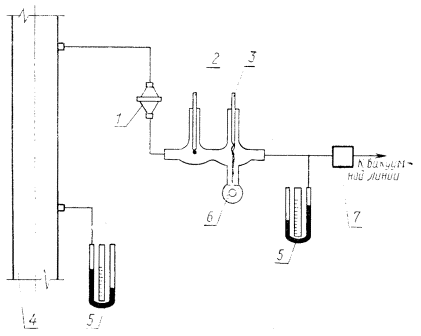 газоход; 5 - сборник конденсата; 6 - манометр; 7 - реометр. Черт. 2. 2.3. При выполнении измерений должны быть соблюдены следующие условия: - до прохождения газа через психрометр или конденсатор его следует очистить от пыли, пропустив через фильтр; - пробы необходимо отбирать таким образом, чтобы исключить выпадение влаги по ходу газа до психрометра или конденсатора, для чего пробоотборный тракт, включая психрометр, должен быть теплоизолирован. 3. ВЫПОЛНЕНИЕ ИЗМЕРЕНИЙ.3.1. Психрометрический метод. 3.1.1. Заливают психрометр дистиллированной водой и, установив по реометру расход отбираемого газа не менее 20 дм3/мин, прогревают систему в течение 10 - 15 мин. 3.1.2. При расходе газа через систему не менее: 20 дм3/мин через каждые 5 мин проводят пять измерений показаний сухого и влажного термометра. Показания сухого термометра соответствуют температуре газа, прошедшего через психрометр; показания влажного термометра - несколько ниже за счет испарения с его поверхности влаги, количество которой зависит от влажности проходящего через психрометр газа. Результаты измерений фиксируют в журнале, форма которого приведена в приложении 2. 3.2. Конденсационный метод. 3.2.1. Устанавливают такой расход охлаждающей воды или другого хладагента через конденсатор, чтобы температура газа после конденсатора была ниже точки росы. 3.2.2. Собирают в предварительно взвешенном сборнике не менее 30 см3 конденсата. Аналогичную операцию проводят пять раз. Массу уловленного конденсата определяют как разность масс сборника с конденсатом и предварительно взвешенного сухого сборника. 3.2.3. Измеряют температуру газа после конденсатора t и количество газа, пропущенного через конденсатор. 3.2.4. Результаты измерений фиксируют в журнале, форма которого приведена в приложении 2. 4. ОБРАБОТКА РЕЗУЛЬТАТОВ ИЗМЕРЕНИЙ.4.1. Психрометрический метод. 4.1.1. Парциальное давление водяных паров при условиях внутри психрометра (Рпп) в килопаскалях вычисляют по формуле