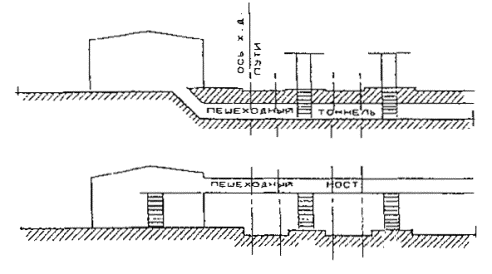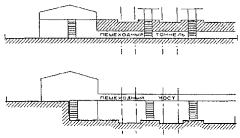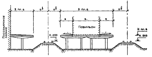 Рис 1.1. Типы вокзалов в зависимости от взаиморасположения в плане пассажирского здания, платформ и перронных железнодорожных путей в) тупиковый, когда пассажирское здание и примыкающая к нему распределительная (лобовая) платформа располагается поперек тупиковых перронных железнодорожных путей и платформ, замыкая их; г) русловый, надпутный или подпутный (варианты по местным условиям), когда пассажирское здание располагается непосредственно над или под перронным железнодорожными путями и платформами. Вокзалы этого тина особенно эффективны в условиях сложившейся затесненной городской застройки, при сложном рельефе местности; д) комбинированный, сочетающий в себе черты нескольких указанных выше типов вокзалов. 1.10. В зависимости от местных условий и от взаиморасположения по вертикали привокзальной площади, пассажирского здания и платформ (перронных железнодорожных путей) вокзалы могут быть трех типов (рис. 1.2.): а) одноуровневый (горизонтальный), когда площадь, здание (полы первого этажа) и платформы находятся примерно на одном уровне: - с использованием пешеходного тоннеля; - с использованием пешеходного моста; б) двухуровневый пониженный, когда площадь и здание (полы первого этажа) находятся ниже платформ примерно на этаж; с использованием пешеходного тоннеля; двухуровневый повышенный, когда площадь и здание (его часть, обращенная на площадь) находятся выше платформ примерно на этаж; с использованием пешеходного моста; в) многоуровневый, когда площадь, здание и платформы находятся в нескольких уровнях, в том числе непосредственно друг над другом, с использованием пешеходных тоннелей и мостов в разных сочетаниях (комбинациях). 1.11. При разработке проектов вокзалов следует руководствоваться положениями действующих межгосударственных и государственных стандартов (ГОСТ, ГОСТ Р), строительных норм и правил (СНиП), санитарных норм и правил, норм пожарной безопасности (НПБ), Правил технической эксплуатации железных дорог Российской Федерации, настоящих норм, а также других нормативно-технических документов в соответствии с приводимыми по тексту ссылками на них (см. р.2 и далее). 1.12. При проектировании вокзалов, расположенных в Северной строительно-климатической зоне, в районах с жарким климатом и в районах с повышенной сейсмичностью, кроме требований настоящих норм, должны учитываться специальные требования на основе соответствующих нормативных документов.