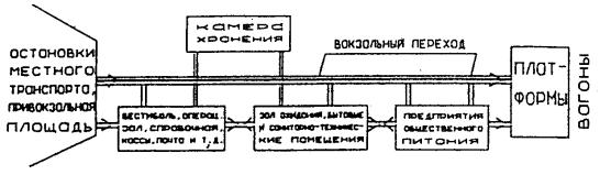г) устройства и помещения вокзала надлежит располагать с учетом рациональной технологической последовательности совершаемых пассажирами операций, исключающей возвратные движения и чрезмерное сосредоточение пассажиров в отдельных местах вокзала. Следует предусматривать четкое зонирование (отделение) шумных операционных помещений (касс, справочных бюро, вестибюлей, камер хранения и т.п.) от более тихих и спокойных помещений зоны ожидания (залы ожидания, предприятия общественного питания и т.п.).