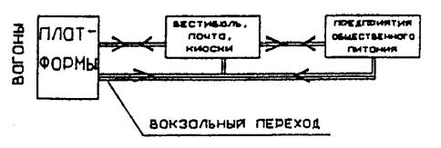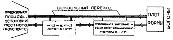 б) пассажиры прибытия, как правило, не нуждаются в сервисных услугах вокзала. Им следует организовать возможность пройти кратчайшим путем с платформ на привокзальную площадь к остановкам местного транспорта. Часть пассажиров проходит в камеры хранения ручного багажа, санитарно-бытовые, справочные помещения и т.п.;