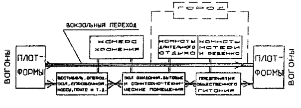 пассажирских сообщений МПС России 1. ОБЩИЕ ПОЛОЖЕНИЯ1.1. Настоящие нормы распространяются на проектирование новых, реконструкцию и (или) техническое перевооружение (модернизацию) действующих железнодорожных вокзалов, предназначенных для обслуживания пассажиров дальнего следования (далее - прямого и местного сообщений) с расчетной вместимостью 50 пассажиров и более. Нормы обязательны для всех организаций и предприятий, осуществляющих проектирование и строительство вокзалов, сооружаемых как самостоятельно, так и в объединении с помещениями для пригородных пассажиров, электрической централизации (ЭЦ), связи, багажных отделений, товарных контор и других железнодорожных служб. Определение специальных терминов, использованных в настоящих нормах приведено в обязательном приложении 1. 1.2. Проектирование объединенных (железнодорожно-автобусных и др.) вокзалов, вокзалов на пограничных станциях, в других особых условиях в части, касающейся железнодорожных пассажиров и служб, производится на основе настоящих норм; для других служб - по заданию на проектирование. Проектирование вокзалов с расчетной вместимостью менее 50 пассажиров, а также устройств для обслуживания пассажиров на небольших пассажирских остановочных пунктах (обгонных пунктах, разъездах и т.п.) должно осуществляться в соответствии с заданием на проектирование. Примечание. Отдельные отклонения от настоящих норм (по номенклатуре, площадям помещений и т.д.) допускаются при надлежащем обосновании по согласованию с органами, утверждающими проект, и излагаются в задании на проектирование. 1.3. Под вокзалом в настоящих нормах понимается комплекс зданий, сооружений и устройств, необходимых для обслуживания пассажиров дальнего следования, расположенный на одной железнодорожной станции (пассажирском остановочном пункте) с единым административным подчинением. Вокзал включает: пассажирское здание и павильоны, пассажирские платформы с навесами или без них, переходы через железнодорожные пути (вокзальные переходы) в одном или в разных уровнях, малые архитектурные формы и визуальные коммуникации. Отдельный вокзал в зависимости от местных условий может иметь не все перечисленные выше составляющие его элементы. 1.4. Основное технологическое назначение вокзала - это обеспечение безопасного, быстрого и удобного обслуживания пассажиров отправления при оформлении проездных документов, а также во время ожидания поезда; посадки и высадки из вагонов; кратковременного обслуживания пассажиров прибытия, а также встречающих и провожающих. При проектировании вокзалов особое внимание должно быть уделено вопросам удобной, безопасной и быстрой пересадки пассажиром с одного вида транспорта на другой. Например, с железнодорожных поездов на внутригородские (местные) виды транспорта (автобусы, метро и др.) и в обратном направлении. 1.5. Проектирование вокзала (нового, реконструируемого) следует проводить с учетом планировочной структуры населенного пункта и станции, на основе технологического и архитектурно-градостроительного решения транспортного узла, в котором, наряду с вокзалом, должны быть комплексно рассмотрены следующие технологически связанные между собой элементы: - привокзальная площадь (прилегающая к вокзалу территория со стороны населенного пункта) с подъездами и по