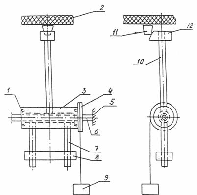 зафиксирован в вороте. На другом конце нити закрепляют рабочий груз 9. К