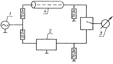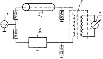 - подсоединяют измеряемую коаксиальную пару к рефлектометру № 2 (диапазон 1 - 610 МГц). Подсоединение следует производить через разъем без применения соединительных шнуров, с тем чтобы избежать дополнительных погрешностей. Противоположный конец коаксиальной пары на В. Ч. нагружают сопротивлением 75 Ом;