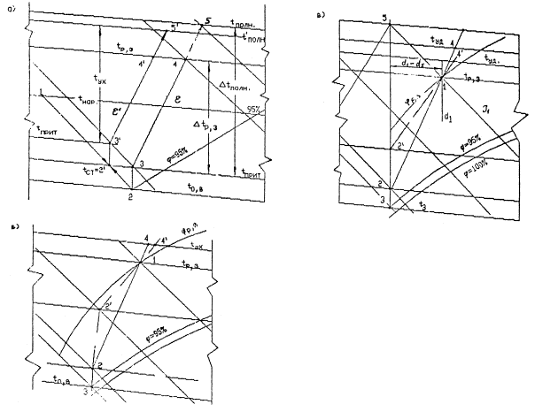 б) при подаче наружного воздуха системами приточной вентиляции без обработки его водой по адиабатному циклу где: