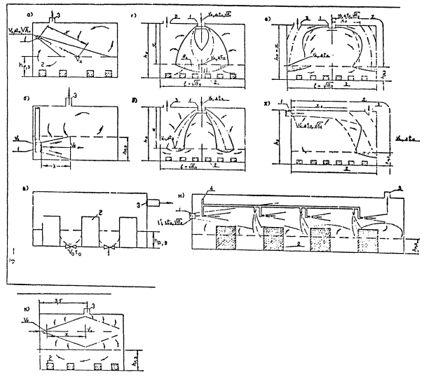 рабочая документация на которые разработана ЦНИИЭП инженерного оборудования. 29. Подачу воздуха наклоненными струями в рабочую зону по рис. 2а в помещения с кратностью воздухообмена менее 3 - 5 1/ч, при удельном расходе воздуха 12 - 40 куб. м/(кв. м · ч), рекомендуется осуществлять с высоты не более 4 м; в помещения с большей кратностью воздухообмена с высоты более 4 м. 30. В помещениях с крупногабаритным технологическим оборудованием (высотой более 3 м) предпочтительна подача воздуха: - непосредственно в рабочую зону по рис. 2б; - наклоненными струями в пространство между технологическим оборудованием по рис. 2а; - сосредоточенно с использованием направляющих сопел по рис. 2и или закрученными струями из напольных воздухораспределителей рис. 2в. [16]. 31. Отопительно-вентиляционные системы с направляющими соплами (рис. 2и) рекомендуется применять в помещениях, длина которых не более чем в 2 раза превышает эффективную длину сосредоточенных струй, а также если сосредоточенными струями нельзя подать необходимое количество теплоты или холода. Системы по рис. 2и могут применяться при работе систем с переменным расходом воздуха. 32. В помещениях конструкторских и проектных бюро, контор рекомендуется подавать воздух в направлении окон через воздухораспределители типа РР, РВ и РРНП*, установленные выше обслуживаемой зоны или непосредственно под окнами через воздухораспределители эжекционных кондиционеров доводчиков (ЭКД). Такая подача воздуха уменьшает отрицательное воздействие ниспадающих холодных токов от окон. 33. В помещениях высотой менее 5 - 6 м или в отдельные зоны, имеющие подшивной потолок (торговые залы, балконы зрительных залов, трибуны спортивных залов), рекомендуется подавать воздух настилающимися веерными струями через воздухораспределители типа ВДШп и ПРМ (рис. 2е). При наличии на потолке выступающих конструкций (балки, ригели, ребра), а также светильников с большими тепловыделениями рекомендуется подавать воздух коническими и неполными веерными струями на высоте 3 - 6 м через воздухораспределители типа ПРМ, ВК*, РВ и РРНП*. 34. В системах с переменным расходом воздуха, подачу воздуха рекомендуется осуществлять через воздухораспределители, позволяющие изменять угол наклона (ВВР) или угол наклона и форму струи от веерной до смыкающейся конической (ВР и ПРМ) и от неполной веерной до компактной (РВ), а также отопительно-вентиляционными системами с направляющими соплами. 35. Расчет воздухораспределения следует производить в соответствии с «Рекомендациями по выбору и расчету систем воздухораспределения», серия А3-669, М., 1979 г. [3] и по выпускам «О» соответствующей серии типовых чертежей (см. приложение 3). 36. Расчет воздухораспределения с направляющими соплами следует