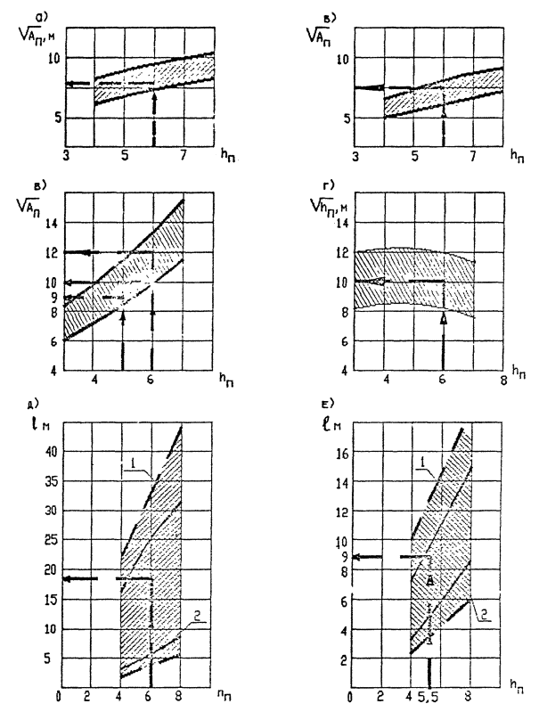 общественных зданиях», М., ЦНИИЭП инженерного оборудования, 1981 г. [17]. 6. Распределение воздуха для достижения равномерной температуры по площади помещения38. В пунктах 38 - 44 приводятся дополнительные расчеты распределения воздуха в помещениях, в которых кондиционирование воздуха должно обеспечить равномерное распределение температуры по их площади. С этой целью по рис. 2 следует выбрать одну из следующих схем: а) выпуск воздуха из плафонов струей по схеме на рис. 2г; расчет проводится по номограмме на рис. 3а или рис. 3б, если струе обеспечена скоростная характеристика, соответственно т = 1,1 или 3,6; б) выпуск настилающейся струей по схеме на рис. 2е или конической рис. 2д, расчеты производятся соответственно по номограмме на рис. 3в или рис. 3г; в) выпуск воздуха из решетки струей настилающейся на потолок по схеме на рис. 3ж, расчет следует производить по номограмме на рис. 3д или рис. 3е, обеспечив скоростной коэффициент m = 6 и ширину струи не более bмакс =2 (lп + hп - hр,з)/m; при m = 2,4 - ширина струи может быть увеличена вдвое; здесь lп, hп, hр,з - длина помещения или его зоны в направлении распространения струи, высота помещения и рабочей зоны, м; г) ширина струи при выпуске воздуха из плафонов не должна быть более