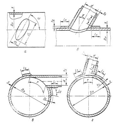 цилиндрических и конических обечаек в случае, когда ось штуцера (черт. 9б) лежит в плоскости продольного сечения обечайки