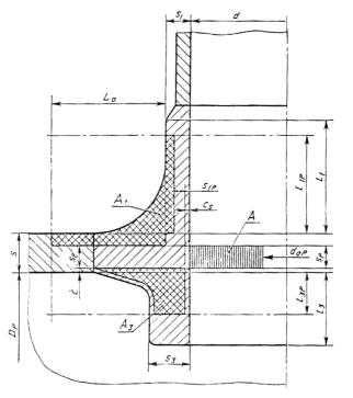 коэффициент Для овального штуцера в этой формуле d = d1. 2.4. Расчетные длины штуцеров Расчетные длины внешней и внутренней частей круглого штуцера, участвующие в укреплении отверстий и учитываемые при расчете (черт. 4), определяют по формулам: Для овального штуцера (черт. 10) в этих формулах d = d2. В случае проходящего штуцера (черт. 5) s3 = s1. 2.5. Расчетная ширина 2.5.1. Ширину зоны укрепления в обечайках, переходах и днищах определяют по формуле