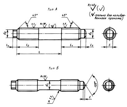 Дата введения 01.01.82 Настоящий стандарт распространяется на упорные шпильки, применяемые для фланцевых соединений арматуры, соединительных частей трубопроводов, используемых в химической и нефтехимической промышленностях на Ру свыше 10 до 100 МПа (свыше 100 до 1000 кгс/см2), при температуре от минус 50 до плюс 510 °С. Требования разд. 2, 3, 4; п.п. 1.1, 1.2, 5.1, 5.2, 5.4, 5.6, 5.8 являются обязательными, другие требования настоящего стандарта являются рекомендуемыми. (Измененная редакция, Изм. № 2). 1. КОНСТРУКЦИЯ И РАЗМЕРЫ1.1. Шпильки должны изготовлять двух типов: А - с одинаковыми номинальными диаметрами резьбы и гладкой части; Б - с номинальными диаметрами резьбы больше номинального диаметра гладкой части. Для использования при температуре свыше 200 °С должны изготовлять шпильки только типа Б. 1.2. Конструкция и размеры шпилек должны соответствовать указанным на чертеже и в табл. 1. мм