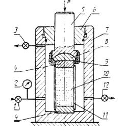 стандарта преследуется по закону Настоящий стандарт распространяется на твердые горные породы с пределом прочности при одноосном сжатии не менее 1 МПа и устанавливает метод определения предела их прочности при объемном сжатии цилиндрических или призматических образцов. Метод предназначен для испытаний аналогичных по характеристикам или одинаковых объектов (породных образцов) проводимых для определения их характеристик при расчетах и проектировании горных работ, оборудования, проведении научно-исследовательских работ, а также для сравнения и оценки методов испытаний. Стандарт не распространяется на мерзлые горные породы. Сущность метода заключается в измерении разрушающей сжимающей силы, приложенной к торцам образца через стальные плоские плиты при боковом сжатии его гидростатическим давлением. 1. МЕТОД ОТБОРА ПРОБОтбор проб - по ГОСТ 21153.0-75 со следующими дополнениями: размеры и объем проб должны обеспечивать изготовление образцов необходимого размера и количества, указанного в п.п. 3.4 и 3.8; допускается взамен парафинирования производить консервацию проб негигроскопических пород битумированной бумагой по ГОСТ 515-77, полиэтиленовой пленкой по ГОСТ 10354-82 или другими водонепроницаемыми материалами, не вступающими во взаимодействие с горными породами; при отборе проб дополнительно отбирают несколько кусков породы общей массой не менее 200 г для определения влажности пробы; куски дробят и сразу же помещают в бюксы, которые для надежной герметизации обматывают клейкой лентой. Определение влажности - по ГОСТ 5180-84. 2. ОБОРУДОВАНИЕ, ИНСТРУМЕНТЫ И МАТЕРИАЛЫДля проведения испытаний применяют оборудование, инструменты и материалы по ГОСТ 21153.0-75 со следующими дополнениями: станки обдирочно-шлифовальный любой конструкции с плоским чугунным диском, плоскошлифовальный и токарный - для подготовки образцов; машины испытательные или прессы, отвечающие требованиям ГОСТ 8905-82 и ГОСТ 9753-81, максимальное усилие которых не менее чем на 20 % превышает предельную нагрузку на образец; насос гидравлический любой конструкции, максимальное рабочее давление которого не менее чем на 20 % превышает предельное значение гидростатического давления на боковую поверхность образца; камеру объемного сжатия, изображенную на черт. 1 или любой другой конструкции для размещения в ней образца и создания гидростатического давления на его боковые поверхности, обеспечивающую по ГОСТ 21153.2-84 соосное приложение осевой нагрузки к образцу (отклонение от соосности не более 0,5 мм) через стальные плиты; манометры образцовые по ГОСТ 6521-72; угольник слесарный по ГОСТ 3749-77; материал изоляционный (резина трубчатая по ГОСТ 4750-79, клей, образующий при высыхании эластичную и прочную пленку, устойчивую к воздействию рабочей жидкости, например, "Момент-1" и по ТУ 6-15-1268-80 и т.п.) - для предохранения образца от проникновения в его поры рабочей жидкости; рабочую жидкость (любые технические масла, глицерин и др.); шлифпорошок № 12-8 по ГОСТ 3647-80 - для доводки поверхности торцов образцов.