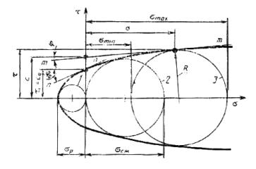Мора в координатах нормальных На черт. 2 приведены наиболее характерные круги Мора, огибающая их кривая и обозначены основные параметры, определяемые по паспорту прочности: предельное