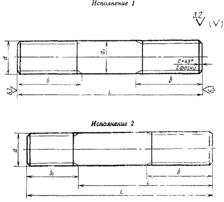 Примечания: 1. Шпильки с размерами, заключенными в скобки, по возможности не применять. 2. При применении шпилек с длиной более 750 мм длина резьбы шпилек должна соответствовать ряду Ra 40 ГОСТ 6636-69. 3. Длина I шпилек A2, Б2, В, Г и Д2 более 0,25 d+b по ряду Ra 40 и дополнительному ряду ГОСТ 6636-69. 4. Допускается для шпилек типов В, Г и Д уменьшение длины резьбового конца Ь, но не более чем на 0,25 d. 5. Длину шпилек типов А и Б необходимо выбирать так, чтобы выступание шпильки из гайки типа А в резьбовом соединении было не менее шага резьбы, включая фаску на конце шпильки. Примеры