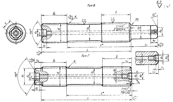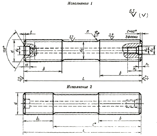 Примечания: 1. Шпильки с размерами, заключенными в скобки, по возможности не применять. 2 Диаметр гладкой части d1 шпилек типа А с мелкой резьбой, выполняемой накаткой, при d>52 мм должен быть равен среднему диаметру резьбы. Допускается диаметр гладкой части шпилек типов Б, В, Г и Д выполнять размером среднего диаметра резьбы, выполненной методом накатки. 3. Размеры радиусов перехода R и концевых фасок не распространяются на шпильки, резьба которых выполняется методом накатки. 4. Длину ввинчиваемого резьбового конца допускается выполнять равной 1,6 d или 1,8 d на шпильках всех типов. 5. Допускается на шпильках типов Г и Д не делать расточку осевого отверстия d6, при этом на шпильках типа Г цилиндрический выступ допускается выполнять по высоте I2, равной удвоенному шагу резьбы. 6. Допускается на шпильках типов В, Г и Д осевое отверстие выполнять диаметром d3, равным 6,7 мм для шпилек М30 и М36 и 8,5 мм для шпилек М42 и М48, размеры гнезда под рым-болт - по ГОСТ 4751-73. 7. Допускается уменьшение диаметра d7 на величину шага резьбы. 8. Допускается для шпилек типов В, Г, Д с номинальным диаметром резьбы до М60 осевое отверстие d3 и гнездо под рым-болт не выполнять. 9. Неуказанные предельные отклонения размеров: