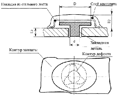 размеры которой соответствует форме и размерам ремонтируемого дефекта. В случае