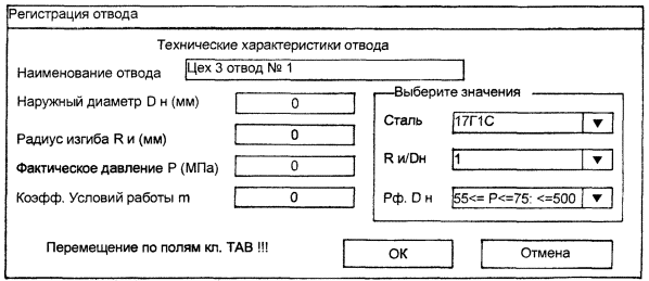 "Наименование отвода", переходят к следующему полю путем нажатия