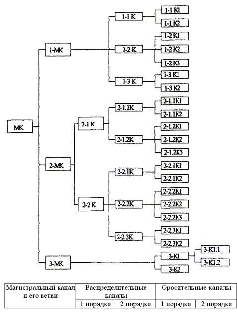 которые указывают перед буквенным обозначением линейного сооружения. Пример - 1-МК; 2-МК или 1-ГД; 2-ГД. Нумерацию ветвей магистрального канала