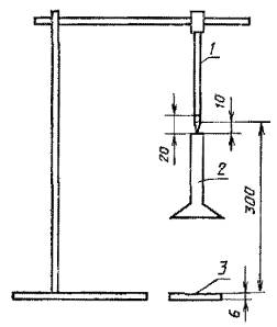 горелка; 3 - вата Черт. 2 Под образцом на расстоянии (9,5±0,5) мм от его нижней кромки в зажиме горизонтально закрепляют проволочную сетку таким образом, чтобы положение свободного конца образца совпало с краем сетки. Испытания образца проводят на установке в соответствии с черт. 1. 3.5. При испытании по методу Б образец закрепляют в зажиме так, чтобы его продольная ось располагалась вертикально и нижний конец находился на расстоянии 300 мм от слоя гигроскопической хирургической ваты площадью 50´50 мм и толщиной 6 мм. Испытание образца проводят на установке в соответствии с черт. 2. 3.6. Газовую горелку, находящуюся в вертикальном положении на расстоянии не менее 150 мм от образца, зажигают и регулируют так, чтобы высота голубого пламени с желтым кончиком была (25±1) мм для метода А и (20±1) мм для метода Б. Подачу воздуха регулируют до тех пор, пока не исчезнет желтый кончик пламени. Высоту пламени измеряют еще раз и при необходимости корректируют. 4. ПРОВЕДЕНИЕ ИСПЫТАНИЙ4.1. Метод А. 4.1.1. Сущность метода заключается в определении скорости распространения пламени по горизонтально закрепленному образцу. Горизонтально закрепленные образцы по стойкости к горению относят к категории ПГ (пламя горелки является источником воспламенения горизонтально закрепленного образца). 4.1.2. Пламя горелки подносят к нижней кромке свободного конца образца. Центральная ось патрубка горелки должна находиться в той же вертикальной плоскости, что и продольная ось образца, и под углом 45° к горизонтали. Пламя подносят на 30с без изменения положения горелки так, чтобы торец образца был погружен в пламя на глубину около 6,5 мм, и затем удаляют от образца. 4.1.3. Если образец сгорает до метки 25 мм менее чем на 30 с, то горелку удаляют от образца, как только пламя достигает метки 25 мм. 4.1.4. Если образец продолжает гореть после удаления горелки, то фиксируют время t (с) горения образца между метками и рассчитывают скорость горения v (мм/мин). 4.1.5. Если фронт пламени распространяется от метки 25 мм, но не достиг метки 100 мм, фиксируют время горения и длину L (мм) поврежденной части образца между меткой 25 мм и местом на образце, до которого распространился фронт пламени. 4.1.6. Материал соответствует категории ПГ, если при его горении выполняются следующие условия: 1) для образцов толщиной от 3 до 13 мм скорость горения не должна превышать 40 мм/мин на участке между метками; 2) для образцов толщиной менее 3 мм скорость горения не должна превышать 75 мм/мин на участке между метками; 3) горение прекращается до того, как пламя достигнет метки 100 мм. 4.1.7. Если хотя бы один образец из пяти не удовлетворяет условиям п. 4.1.6, то испытание проводят еще на пяти образцах. Если хотя бы один образец второй серии не удовлетворяет требованиям п. 4.1.6, то материал не может быть классифицирован как ПГ. 4.1.8. Если скорость горения нельзя рассчитать (образец гаснет после удаления пламени горелки), испытание следует провести по методу Б, чтобы определить наивысшую категорию стойкости к горению, к которой может быть отнесен данный материал. 4.2.1. Сущность метода заключается в определении времени горения и тления вертикально закрепленного образца. По стойкости к горению вертикально закрепленные образцы относят к категориям ПВ-0, ПВ-1, ПВ-2 (пламя горелки является источником воспламенения вертикально закрепленного образца) в соответстви