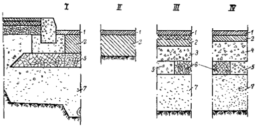 I - асфальтобетонное покрытие на технологическом щебеночном слое; II - то же, на грунте; III - то же, на бетонном основании из тощего бетона; IV - то же, на бетонном основании из бетона 200; 1 - слой износа (асфальтовый бетон типа. А, Б, В, Г, Д; литой, декоративный); 2 - основной (нижний) слой (крупно-, среднезернистый асфальтовый бетон, регенерированный); 3 - основание (тощий бетон); 4 - основание (бетон 200); 5 - технологический слой (щебеночные и гравийные материалы с обработкой или без обработки вяжущими); 6 - то же (тощий бетон, цементно-песчаная смесь); 7 - песчаный подстилающий слой.