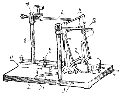 противовес; 6 - ограничительный винт; 7 - рычаг; 8 - образец; 9 - стойка