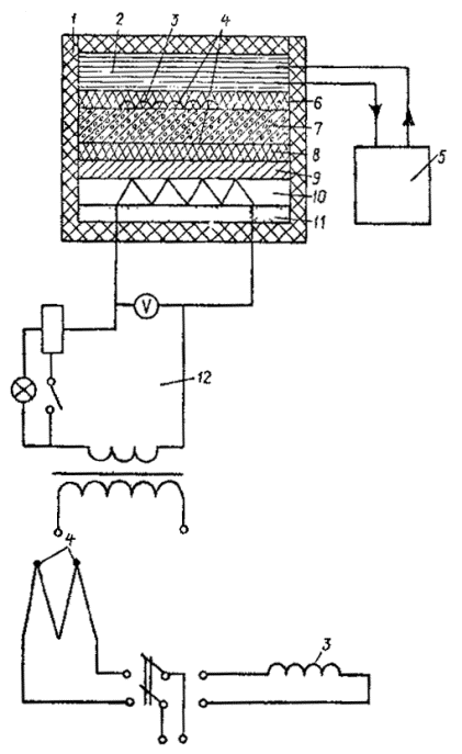 термостат; 6-8 - резина; 7 - образец; 9 - дюралюминий; 10 - нагреватель; 11 -