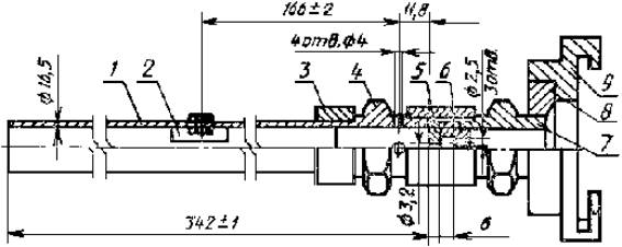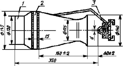 1 - корпус; 2 - пакет сеток; 3 - распылитель Черт. 2 Пожарный ствол для пены низкой кратности 1 - труба; 2 – успокоитель; 3 - муфта; 4, 7 – штуцер; 5 - распылитель; 6 - смеситель; 8 - переходник; 9 - головка напорная ГМ-50 Черт. 3 5.2.2. Подготовка к проведению испытаний В емкости 7 (черт. 1) приготавливают 100 дм3 рабочего