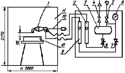 до 106,7 кПа, относительная влажность воздуха от 40 до 80%. 1.3. Проведение испытания В установке (черт. 8) включают воздуходувку и открывают кран 2. Когда