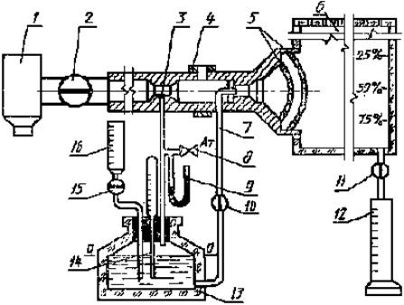 уровень раствора в мерной трубке, закрывают клапаны 5, 13 и кран 6. Открывают