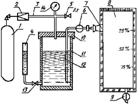 заполнения емкости закрывают кран 6 и клапан на баллоне. Открывают клапан 5 и