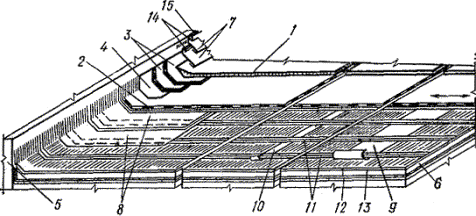 пароизоляция; 13 - стяжка; 14 - полосы 40´3 мм для закрепления защитных фартуков; 15 - герметизирующая