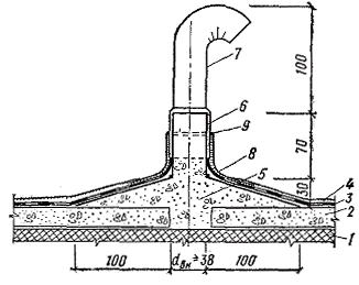 мастика Поверхности оснований под кровлю не должны иметь впадин, бугров и наплывов, мешающих повсеместному плотному склеиванию полотнищ рулонных материалов с основанием и между собой. Ровность основания проверяется контрольной рейкой длиной 3 м; при этом под рейкой может быть не более двух плавно нарастающих просветов глубиной до 5 мм. Поверхность основания плит из бетона, асбестоцемента или цементно-песчаного раствора должна быть огрунтована: раствором битума марки БН-90/10 (ГОСТ 6617-76 с изм.) в керосине или соляровом масле в соотношении по массе 1:2 - 1:3 при устройстве кровель из битумных материалов; раствором каменноугольного пека в бензоле или антраценовом масле в соотношении по массе 1:2 - 1:3 при устройстве кровель из дегтевых материалов. Поверхность выравнивающих стяжек из асфальтобетона или цементно-песчаного раствора должна разделяться температурно-усадочными швами на участки со сторонами до 4 м и до 6 м; в покрытиях с несущими плитами длиной 6 м эти участки должны быть 3´3 м. Температурно-усадочные швы в стяжках должны располагаться над торцовыми швами несущих плит и над температурноусадочными швами в слоях монолитной теплоизоляции. Ширина швов в стяжках и между плитами не должна превышать 5 мм. В случае устройства покрытий с применением комплексных плит повышенной заводской готовности температурно-усадочные швы в основании под кровлю должны устраиваться над торцевыми (поперечными) швами этих плит и совпадать с ними. На швы должны быть наложены полоски шириной не менее 100 мм из рулонного материала, применяемого для устройства кровли, которые склеивают с основанием с одной стороны шва в отдельных местах. Полоски выполняют роль компенсаторов в основании под кровлю (рис. 1). В тех случаях, когда основанием для устройства кровель служат ровные поверхности сборных плит, полоски из рулонных материалов укладывают по всем швам между плитами. 3.6. В местах примыкания к выступающим конструктивным элементам (стенам, парапетам, деформационным швам, шахтам и др.) должны быть выполнены наклонные бортики из цементно-песчаного раствора, песчаного асфальтобетона или легкого бетона под углом до 45° и высотой не менее 100 мм, при помощи которых осуществляется переход от основной плоскости кровли к выступающей конструкции. В тех случаях, когда основанием под кровлю служат теплоизоляционные плиты наклонные бортики выполняют из этих же плит и склеивают их только с верхней поверхностью теплоизоляционного слоя. В тех случаях, когда возможна неодинаковая осадка смежных элементов покрытий, а также несущих конструкций и стен, в покрытии должны устраиваться деформационные швы. В местах пропуска через кровлю труб должны быть установлены патрубки (из металла, поливинилхлорида или других материалов), опирающиеся на несущие плиты или настилы покрытий. 3.7. Слои основного водоизоляционного ковра должны быть усилены на участках ендов (в кровлях с i³2,5%) - двумя слоями рулонного кровельного материала (при рулонных кровлях) или двумя слоями мастик, армированных стекломатериалами (при мастичных кровлях), которые должны быть заведены на поверхность ската (от линии перегиба) не менее чем на 750 мм (см. рис. 1); на карнизных участках кровель - двумя слоями дополнительного ковра по ширине, превышающей ширину сливного фартука, перекрываемого ковром соответственн