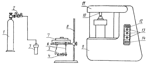 Черт. 1 1 - баллон с кислородом; 2 - редуктор; 3 - калориметрическая бомба; 4 - тигель; 5 - запальная проволока; 6 - держатели тигля и запальной проволоки; 7 - крышка бомбы; 8 - подставка для крышки; 9 - корпус защитного устройства; 10 - клапан для сброса продуктов сгорания; 11 - крышка; 12 - кнопка «сеть»; 13 - сигнальная лампа; 14 - кнопка «запал». САМОУПЛОТНЯЮЩАЯСЯ