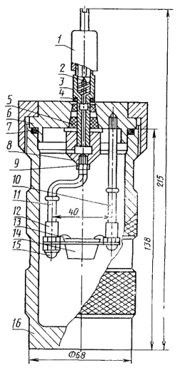 КАЛОРИМЕТРИЧЕСКАЯ БОМБА Черт. 2 1 - колпачок для сброса продуктов сгорания; 2 - золотник; 3 - штуцер; 4 - изолятор; 5 - втулка; 6 - крышка; 7 - уплотнительное кольцо; 8 - гайка специальная; 9 - гайка; 10 - стержень; 11 - тигледержатель; 12 - запальная проволока; 13 - втулка; 14 - тигель; 15 - гайка; 16 - стакан Роль второго электрода