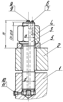 1, 2). 1. Стандарт устанавливает следующие типы резьбовых соединений: Тип А - для затяжки фланцевого соединения ключом гаечным; Тип Б - для затяжки фланцевого соединения гидродомкратом с захватом шпильки за основную резьбу; Тип В - для затяжки фланцевого соединения гидродомкратом с захватом шпильки за резьбовой хвостовик. 2. Типы и размеры резьбовых соединений должны соответствовать указанным на черт. 1 - 3 и в таблице. 3. Соединение типа А применять только для диаметров резьб до М64×6 включительно. Допускается применять резьбовое соединение типа А диаметром резьбы больше М64×6 в случаях, когда невозможна установка на шпильке гидродомкрата (мешает патрубок и т. д.). 4. Допускается изготавливать шпильки без центрального осевого отверстия при условии выполнения дренажных отверстий во фланце корпуса сосуда или аппарата. 5. Выбор исполнения конструкции дренажных отверстий в шпильке или во фланце определяется экономическими факторами изготовления и технологическими возможностями заводов-изготовителей. СОЕДИНЕНИЕ ТИПА А 1 - фланец; 2 - крышка; 3 -