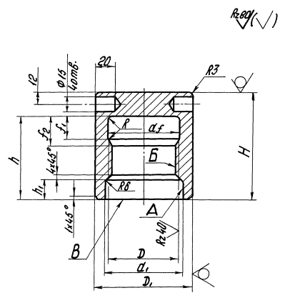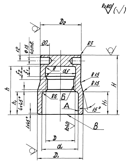 условных обозначений: Колпачок защитный исполнения 1, диаметром резьбы 100 мм с мелким шагом резьбы 6 мм: КОЛПАЧОК М100×6 ОСТ 26-01-143-81. Колпачок защитный исполнения 2, с диаметром резьбы 80 мм, с крупным шагом резьбы 6 мм: КОЛПАЧОК 2М80 ОСТ 26-01-143-81. 3. Резьба метрическая - по ГОСТ 8724-81 (СТ СЭВ 181-75) и ГОСТ 24705-81 (СТ СЭВ 182-75). Профиль резьбы по ГОСТ 9150-81 (СТ СЭВ 180-75). Предельные отклонения размеров отверстия под резьбу - по ГОСТ 19257-73. Предельные отклонения резьб и длины свинчивания - по ГОСТ 16093-81 (СТ СЭВ 640-77). Поля допусков - 7Н. 4. Отклонение от соосности отверстия «А» относительно отверстия «Б» не более 1 мм. 5. Отклонение от перпендикулярности торца «В» относительно оси отверстия «Б» по XII степени точности ГОСТ 24643-81 (СТ СЭВ 636-77). 6. Остальные технические требования по ОСТ 26-01-144-81. 7. Теоретическая масса колпачков защитных приведена в справочном приложении. (Измененная редакция, Изм.